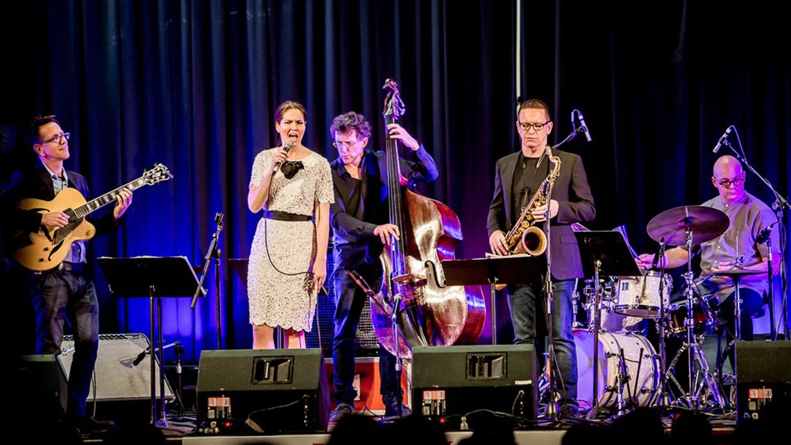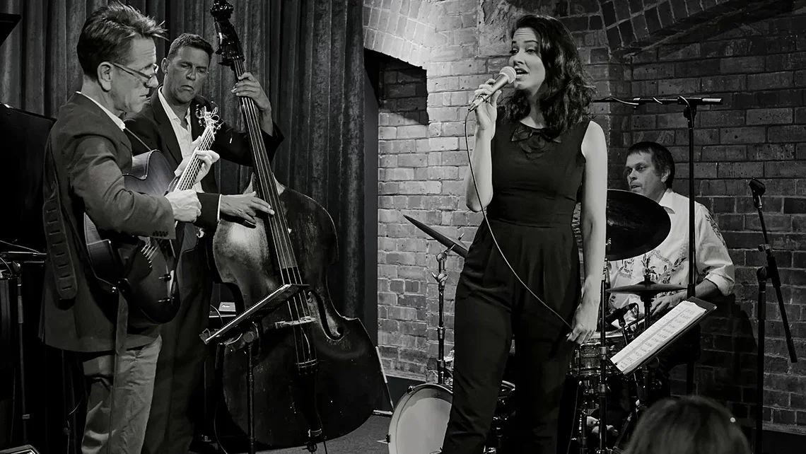 Born in Hampshire, England, and raised in Melbourne, Australia, she came up through the jazz scene the old-fashioned way: mentored by seasoned players, absorbing the tradition night after night. Melbourne's jazz community gave her something formal education rarely does - a swing feel that comes from playing it, not studying it. She spent five years touring with Australian jazz legend James Morrison, who described her as having "a stage presence only matched by the clarity of her voice." She's played herself in a French television drama, played Ava Gardner in an original Australian musical, and performed as a featured soloist with symphony orchestras across Australia and beyond. US critic Will Friedwald calls her "one of the best swing-style vocalists on the current scene."